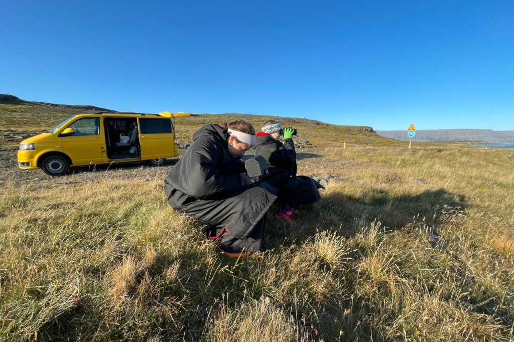 In Iceland, most of our fieldwork takes place from land, in particular using drones to collect aerial images of humpback whales. We are mostly working in the Westfjords, where whales often swim close to land. We frequently drive between our field sites in a yellow van and pull over at safe places on the side of the road. During this time, we have come to appreciate the beauty of watching whales from land, without disturbing animals and amongst beautiful Icelandic scenery.